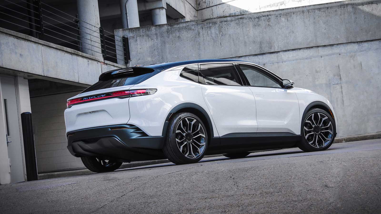 The concept features all-wheel-drive capability and is powered by two 150 kW electric drive motors (EDMs), one in the front and one in the rear. The concept is designed to accommodate larger capacity EDMs, offering the potential for future high-performance applications. Drive motors are located toward the front and rear of the vehicle, maximizing interior space and enabling the large wheel size and wide stance of the Airflow Concept. The battery is designed to achieve between a 350- and 400-mile range on a single charge.