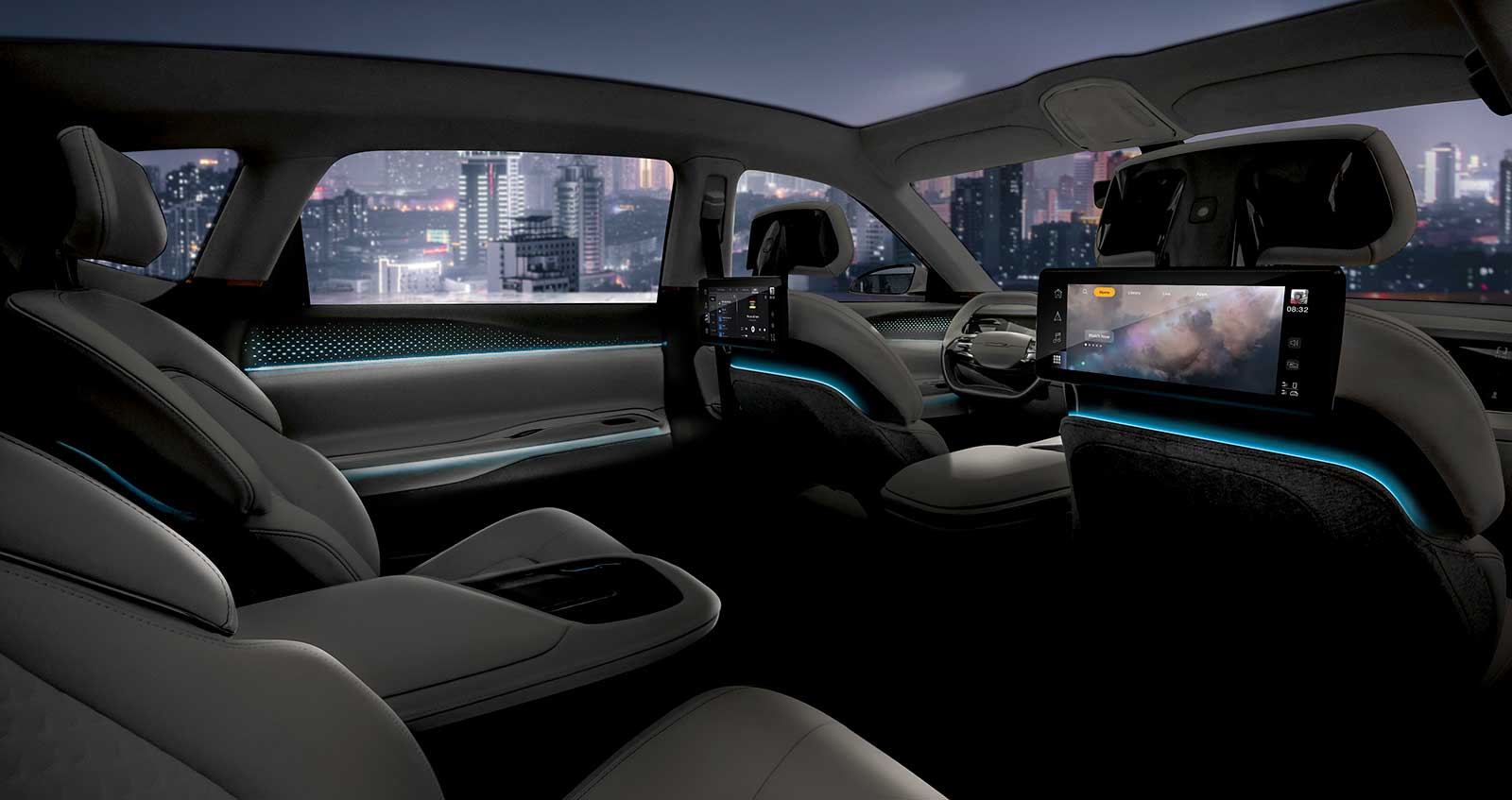 Infotainment screens appear as gloss black sculptures, seamlessly integrating technology within the overall interior composition. Seating uses a unique slim structure that rests on a pedestal base, enhancing comfort and roominess while allowing for maximum legroom, shoulder space and personal storage for each passenger.