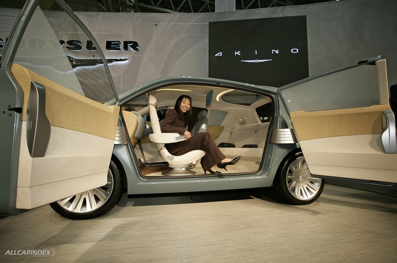 Oasis The Chrysler Akino concept has a single door on the driver side, and two doors on the passenger side that open in opposite directions. This arrangement allows the interior to have a booth-like rear seat with a swiveling passenger seat. The roof features an unusual interlocking form toward the rear which punctuates the design and provides more headroom for the rear seat passengers.