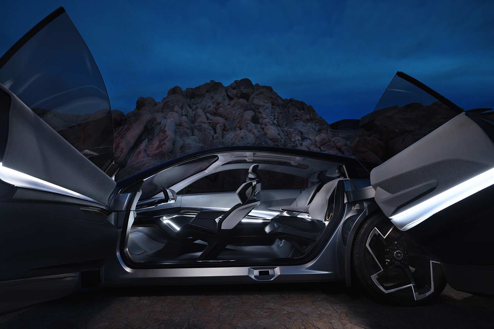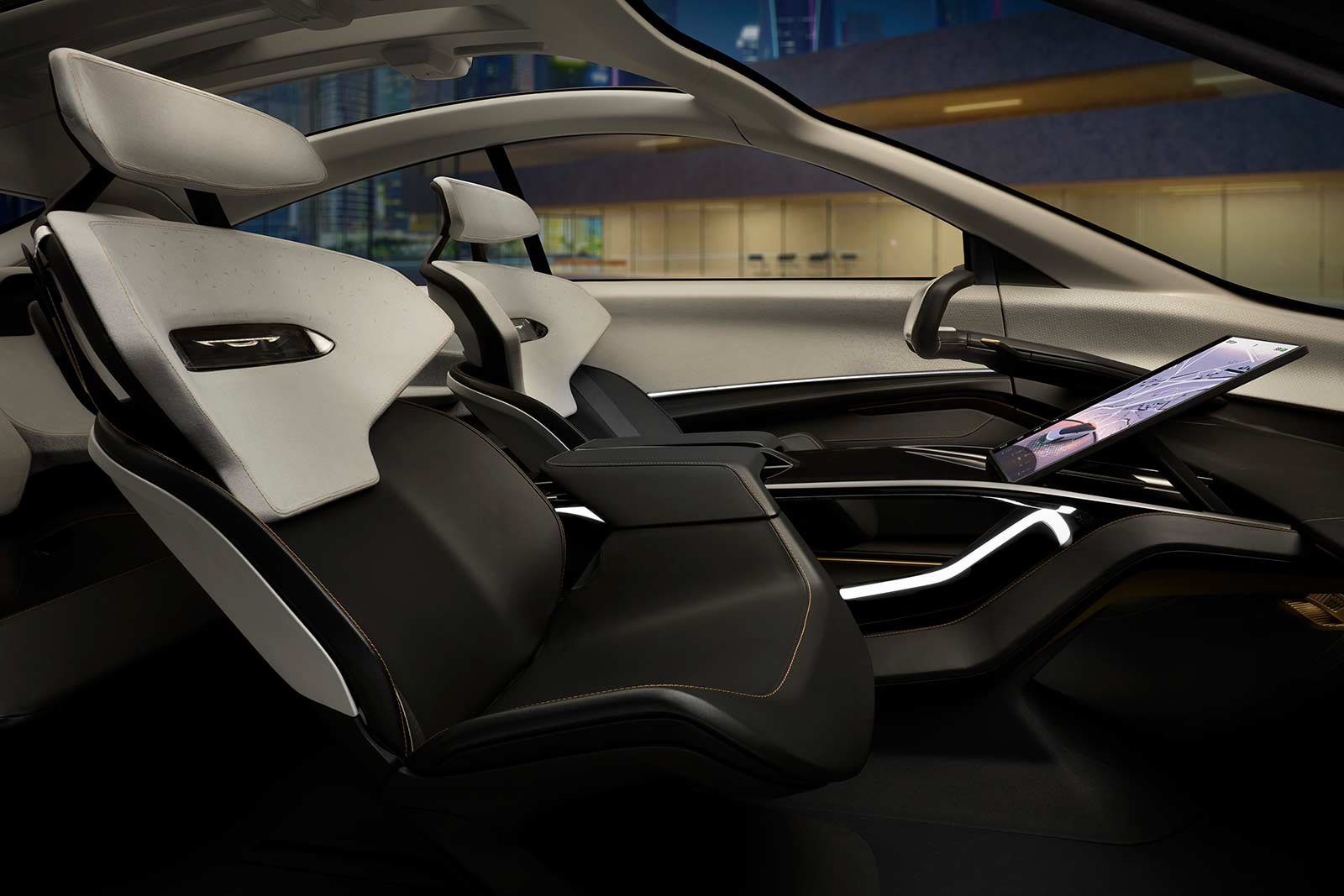 The sculpted cockpit is centered by a cross-car pillar-to-pillar transparent display, providing a forward-looking view of information while keeping eyes on the road. Complementing the display is a stowable 15.6-inch console screen that can be rotated for either portrait or landscape orientation and can assist in start-up and quick access to information. The displays can be fully controlled by voice recognition commands, diminishing the need for driver input.