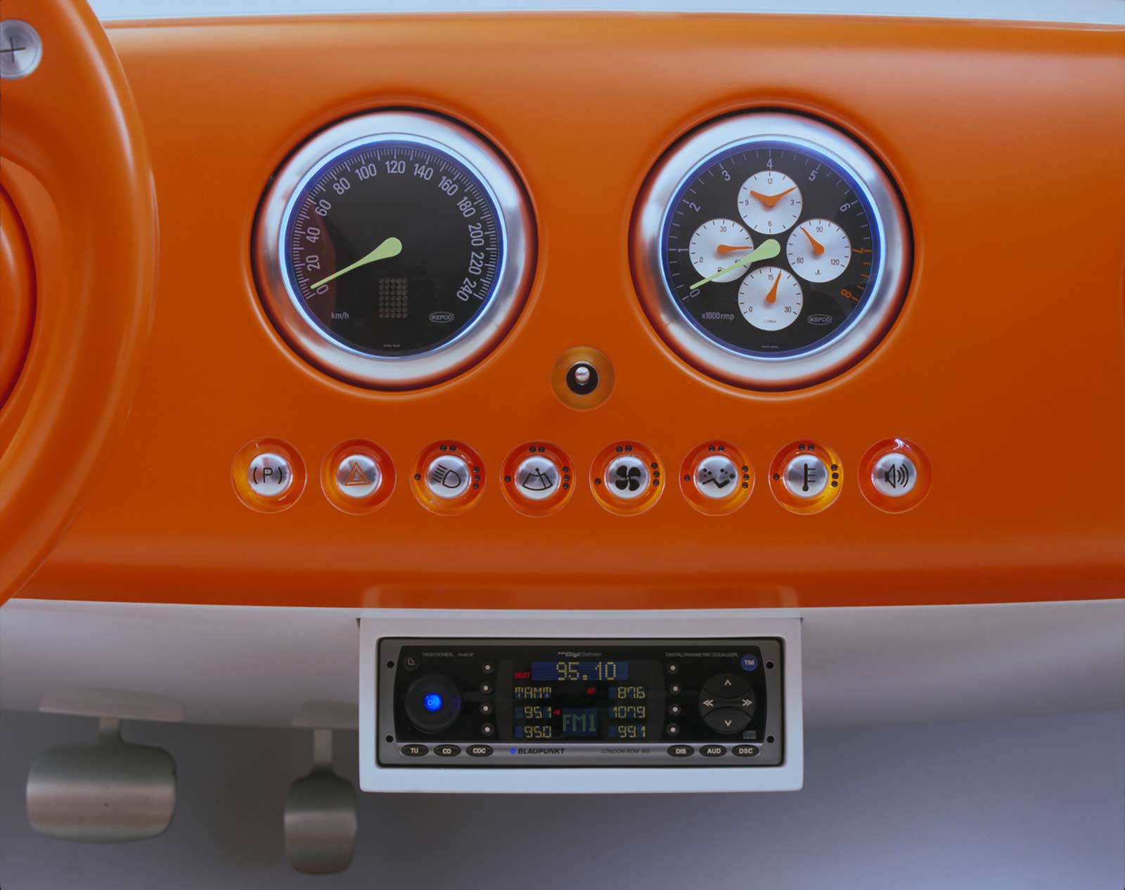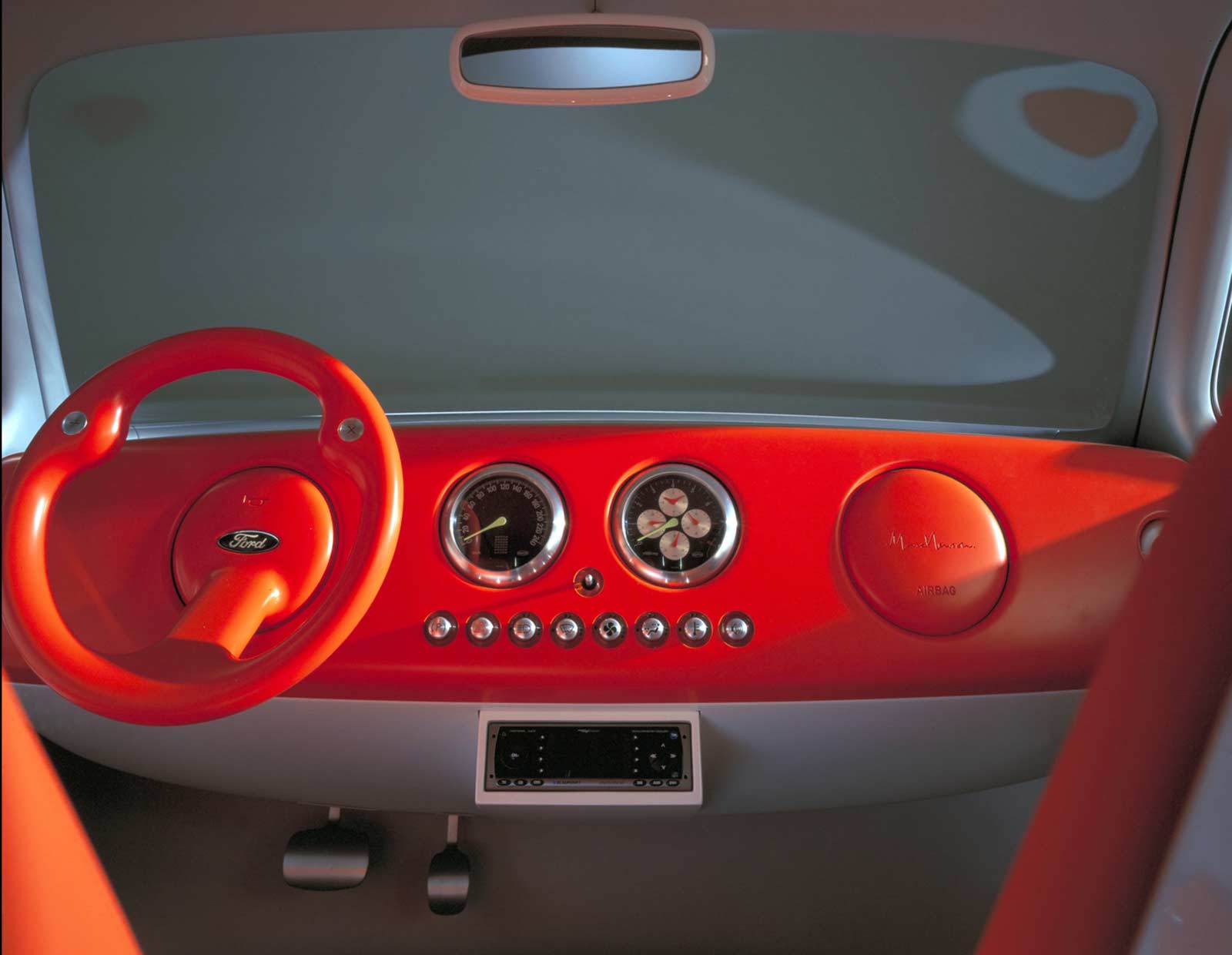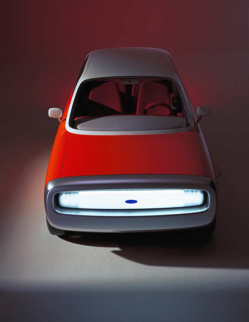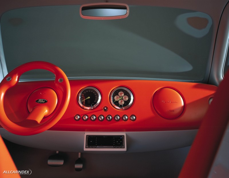 into all vertical surfaces. The cleverly mounted instrument panel and seats appear to "float" in the interior, heightening the sensation of space. The front seats swivel through 90 degrees to facilitate entry and egress. Every element of the Ford 021C has been designed by Marc Newson, apart from the mechanical and electrical systems. Newson even designed the instrument panel graphics, all the switches, the wheels and the tread on the specially produced Pirelli tyres. "It's easily the most comprehensive design job I've ever done," he said. "It was like designing 500 products at once." This extraordinary attention to detail gives the Ford 021C a coherence rarely seen in concept vehicles. Newson, who owns a classic Aston Martin DB4 and has designed everything from glassware to furniture to restaurant interiors, said he wanted to design a car that wasn't intimidating. "I wanted to create a car that was light, likeable and fun," he said. "But more importantly, I wanted the car to connect on an emotional level. "Ask children to draw a car and they'll draw something like this, so in many ways the 021C is a familiar and comfortable object," Newson said. "But it doesn't use many typical automotive design cues, and while it does incorporate some interesting technology, it's not technology used simply for the sake of it."
