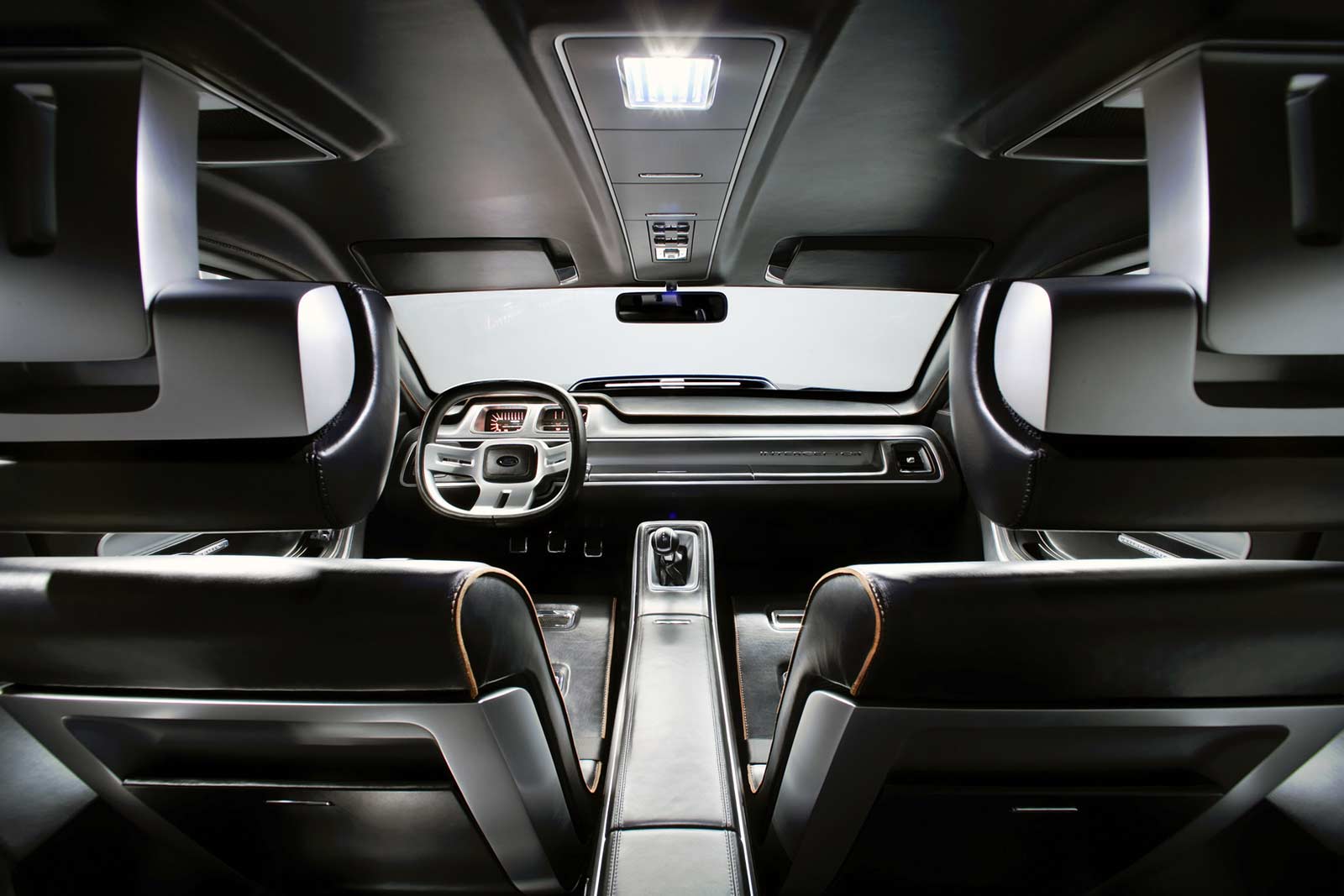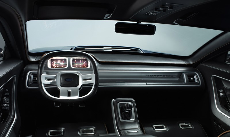 Inside, the Ford Interceptor concept is sleek and thoroughly modern, completed in contrasting black leather and metal finishes.