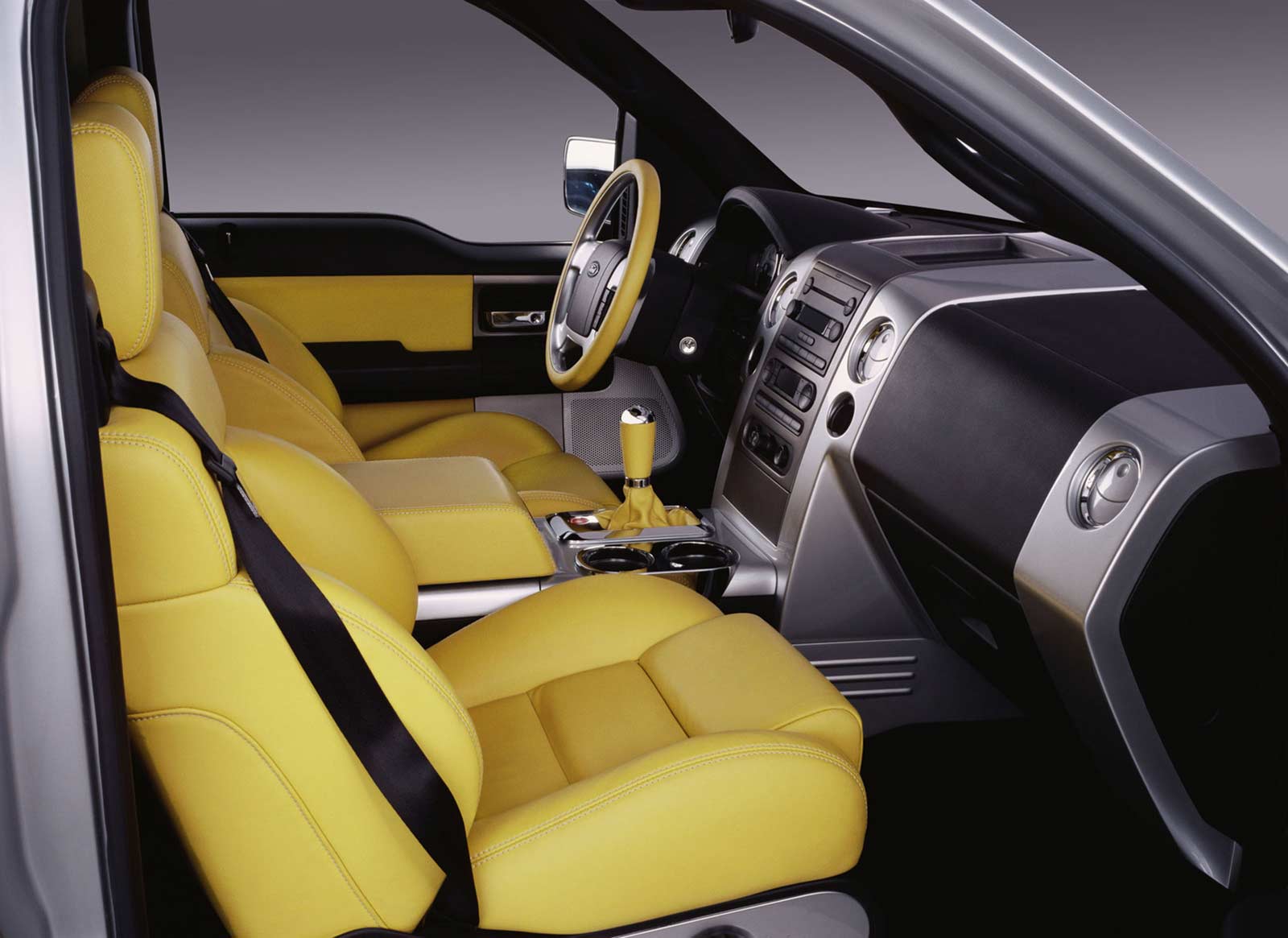 The stunning interior of the SVT Lightning concept perhaps best illustrates the benefits of adapting F-150’s modular design architecture. It builds on the craftsmanship and meticulous detailing of the all-new 2004 F-150, according to Jim Smithbauer, F-150 design manager. “The luxurious Lariat interior was a perfect starting point for the SVT Lightning concept,” Smithbauer says. “The color and trim emphasize the SVT Lightning concept’s aggressive character, while the seat bolsters and console-mounted shifter make the perfect cockpit for the performance enthusiast. The dash and center console are accented with Liquid Silver Metallic to match the exterior. The seats are covered in Mustard Yellow leather, complemented by Ebony carpet and door trim. Even subtle changes emphasize performance, like the red engine start button and the electro-luminescent gauges — an SVT trademark.” Another emphasis on performance is the manual gearbox instead of the top-of-the-line F-150 Lariat’s automatic transmission. Most pickups with a manual transmission have shifters mounted on the floor. The SVT Lightning concept employs a flow-through center console, enabling a short-throw shifter reminiscent of a sports car.