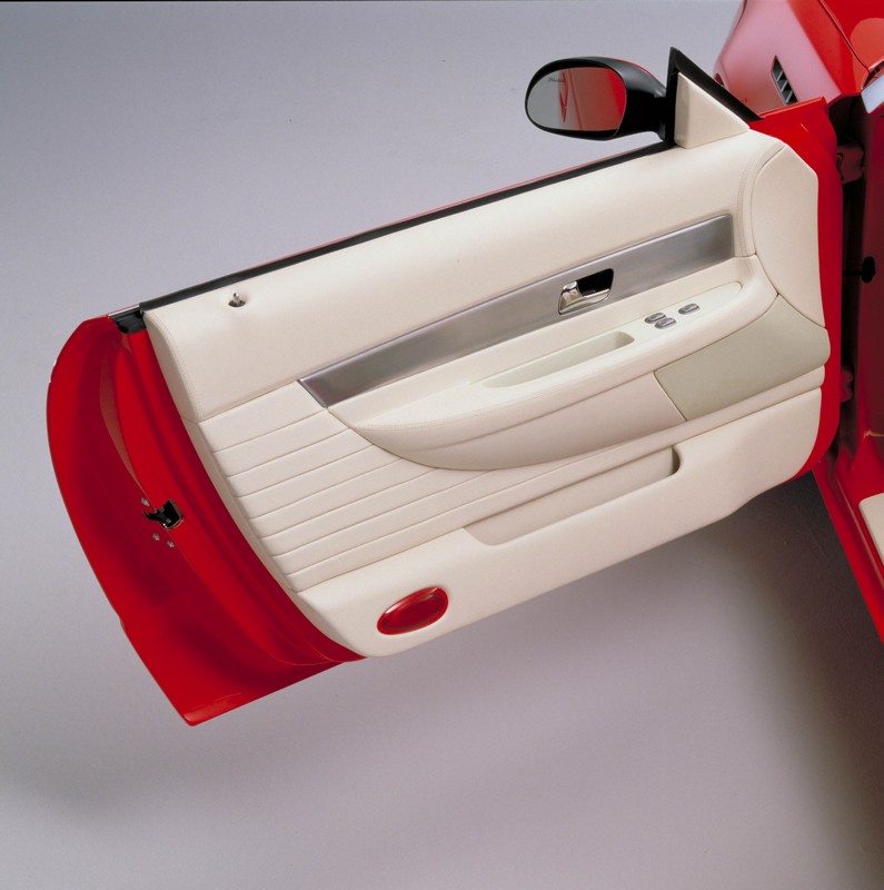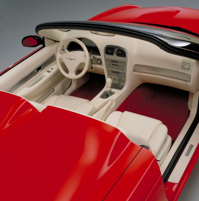 The Thunderbird Sports Roadster concept is a more outward interpretation of the 1962 and 1963 designs. The car reflects the flamboyant '60s finished in vivid red enamel with a white leather interior. The concept features a sloped rear deck with a molded fiberglass tonneau cover and integrated, white leather-covered headrests embossed with the trademark Thunderbird logo. Chrome-finished fasteners secure the tonneau to the roadster. The tonneau cover "waterfalls" between the seats into a relaxed interior environment that features "ceramic" white leather fluted bucket seats. The instrument panel, pillars, scuff plates and interior door trim panels are leather wrapped and feature unique stitching by Draxlmaier. The driver's cockpit area features a leather wrapped three-spoke steering wheel, shifter knob, hand brake and armrest. The cluster appliqué houses turquoise pointers mounted on metal hubs. Metal appliqués on the instrument panel and interior door panels sport a brushed aluminum appearance and aluminum-finished buttons. An integrated chrome hood scoop and large rounded headlamps enhance the vehicle's sleek look. The chrome finished egg-crate design grille also compliments the concept's heritage design. The chrome accent theme is carried to the 18-inch chrome plated wheels fitted with low-profile black sidewall tires. The Thunderbird Sports Roadster concept epitomizes the romance of relaxed, laid back open air driving in a true American beauty.