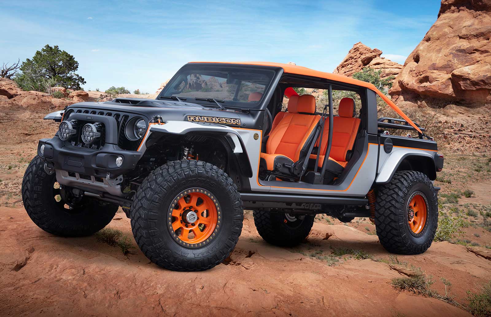 Based on a Jeep Gladiator Rubicon, the most noticeable traits of this truck are not what’s on it, but rather what’s missing. All four doors and B-pillars have been removed for the ultimate open-air freedom. Additionally, a customized hardtop has been perforated and a canvas top has been stretched over top in order to provide shelter from the elements while allowing natural light through.