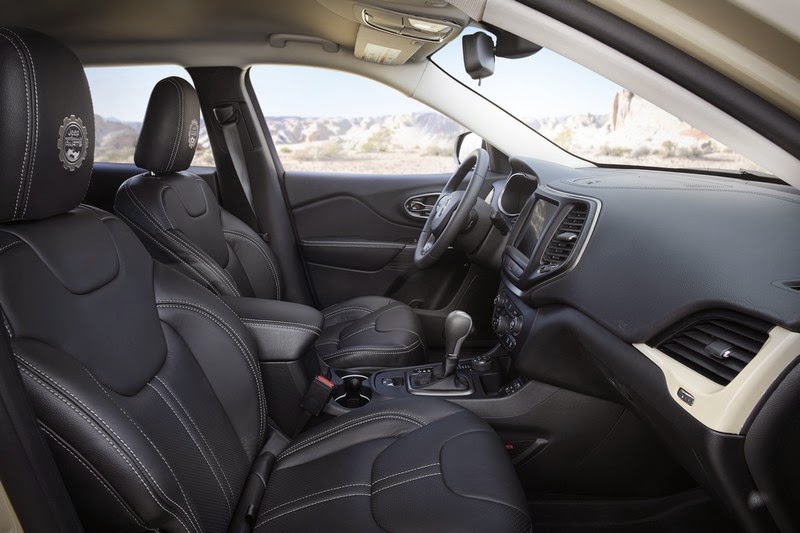 The Cherokee Canyon Trail’s Desert Tan exterior paint is accented with a Satin Black hood that includes a topographical hood decal showcasing Hell's Revenge, a renowned off-road trail in Moab. The exterior also displays Jeep Performance Parts body decal, Satin Black roof accent colors and the 2015 "Four Wheeler of the Year" decal.