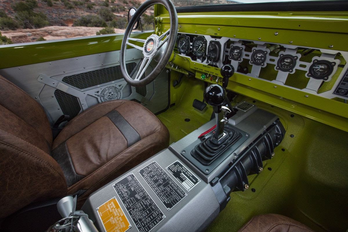 Inside, new Jeep Wrangler seats, free of headrests, have been installed for a sleek, low-back visual. Additionally, water-jetted aluminum components make up a new lightweight and premium instrument panel, as well as door panels. A repurposed vintage 8-71 supercharger now serves to encase the transmission and transfer case shifters and the floors have been bed-lined for enhanced durability.