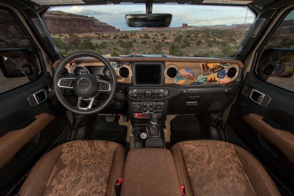 Jeep Wayout has a custom integrated roof-rack system for packing gear up top, and the truck bed houses a Mopar/Decked bed-drawer system for added lockable dry storage on long treks. Inside, bed-lined floors, plus trimmed brown leather seats with laser-etched inserts of topographical maps, have been added.