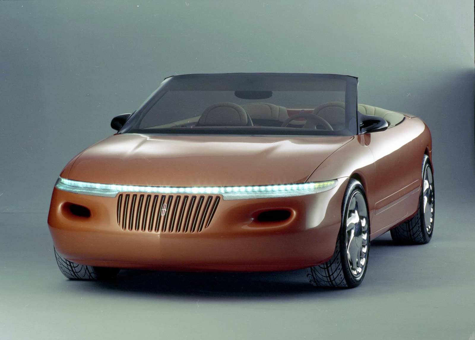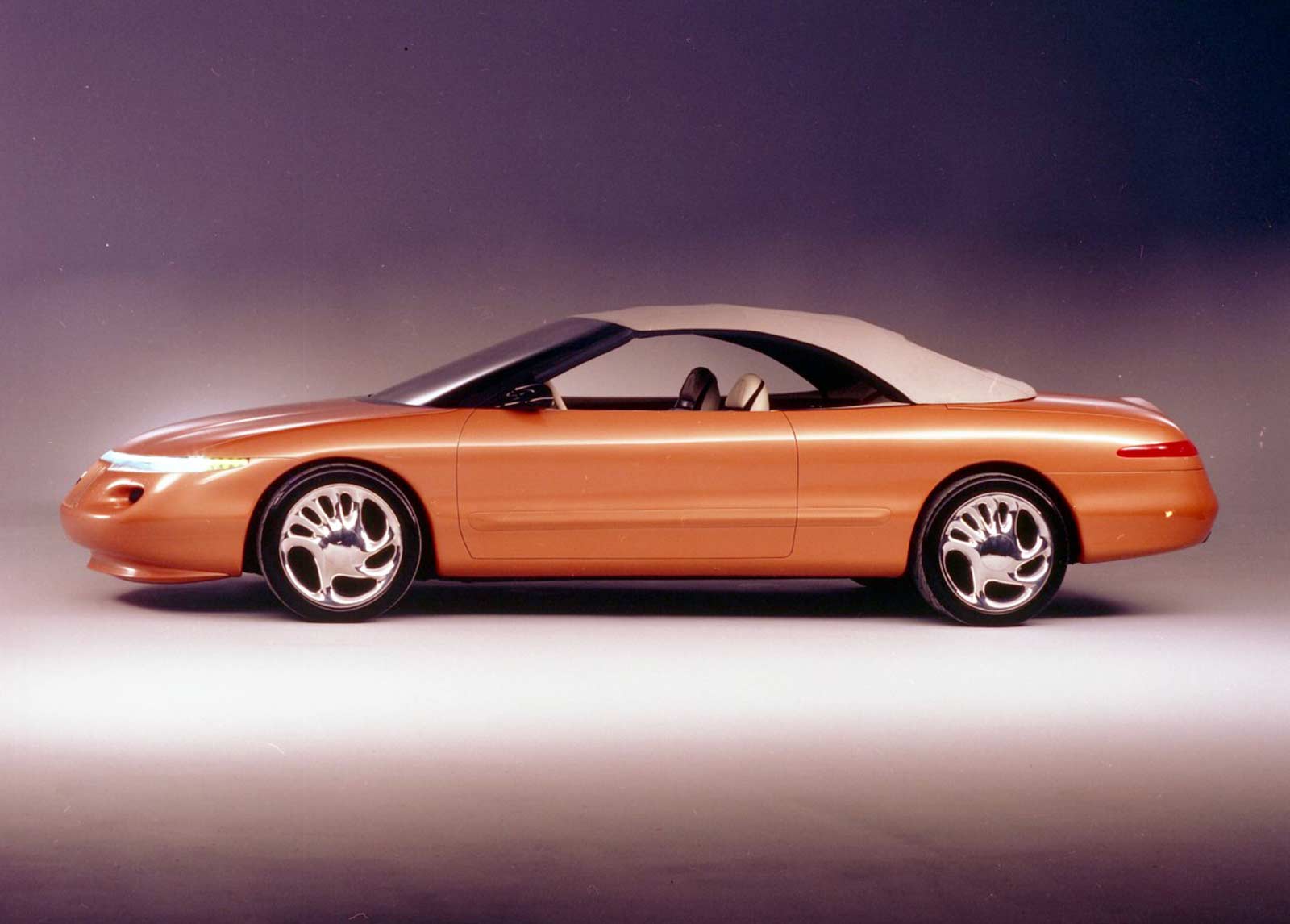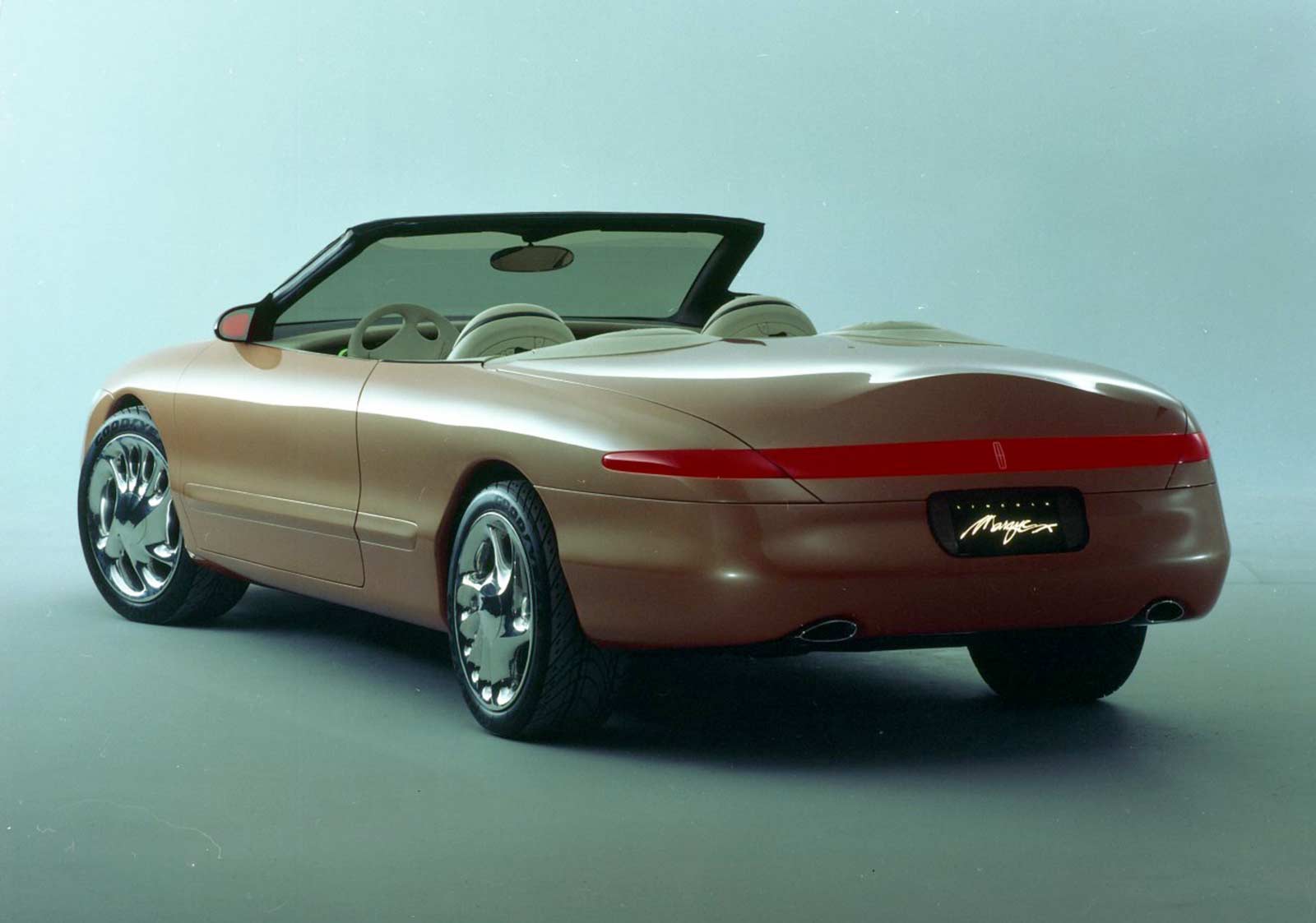 Lincoln's Marque X concept convertible, painted a burnt tangerine pearl orange hue, showcased a cab-forward design to maximize the space available for people. This future flagship featured a simulated spare-tire bulge on its decklid, speed-sensitive front underbody spoiler, low-profile fiber optic headlights, 19-inch cast magnesium wheels, and an electronic, speed-sensitive aerodynamic spoiler. Under the hood sat a 32-valve DOHC V-8, matched to a four-speed automatic transmission. A coded "credit card" was used to start the engine, and in the leather cockpit was a voice-activated telephone, navigation system, and fax machine. For rear passengers, the Marque X contained a pop-up TV and dual temperature food and beverage storage container.