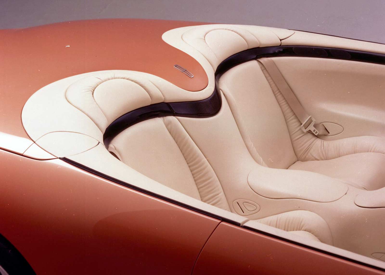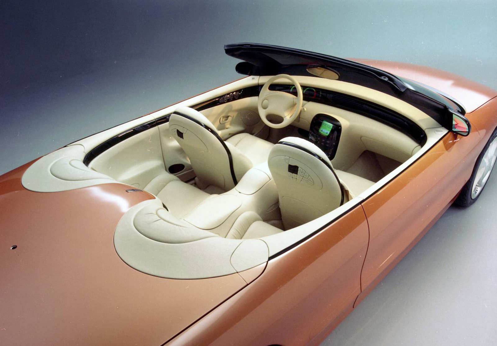The leather interior is soft and sculptured with integrated seats, dual air bags and comfortable wraparound rear seating. The oval-shaped exterior design further is complimented with a strong, horizontal band that graphically encircles the interior compartment, flowing through the instrument panel into the doors and around the rear seat. The band houses many of the individual controls for each of the passengers and creates a clean, uncluttered appearance.