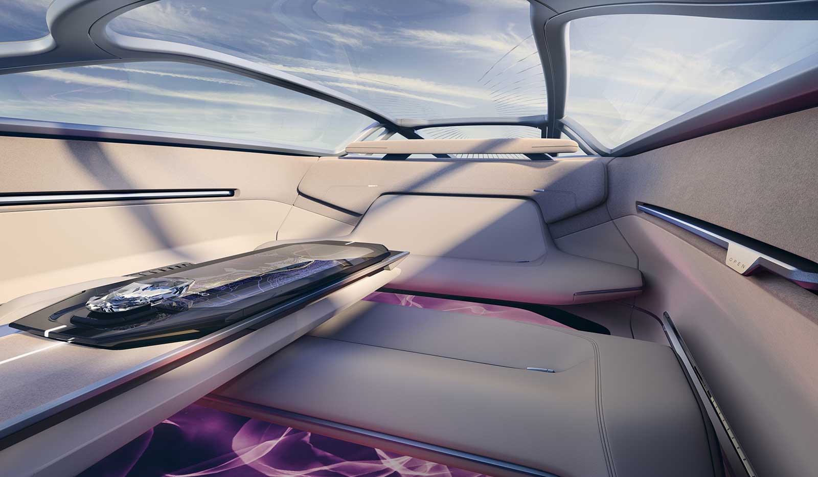 Using the area no longer occupied by a gas engine, a front trunk allows for ample storage, expanding the feeling of spaciousness inside. With electro-chromatic glass that changes from transparent to opaque, the front trunk is instantly recognizable, allowing light in when the vehicle is in motion and darkening to hide stored valuables when parked. Under the front trunk, illuminated first-row floors flow uninterrupted into the interior, creating an airy, open cabin.