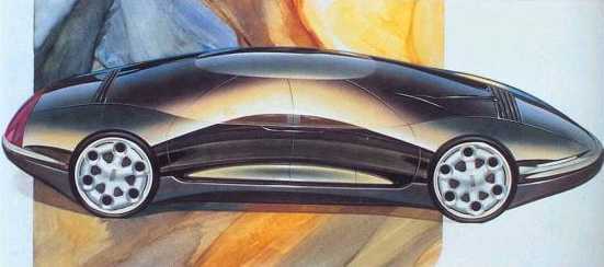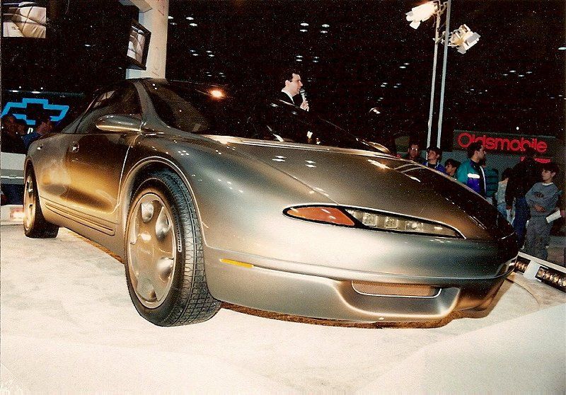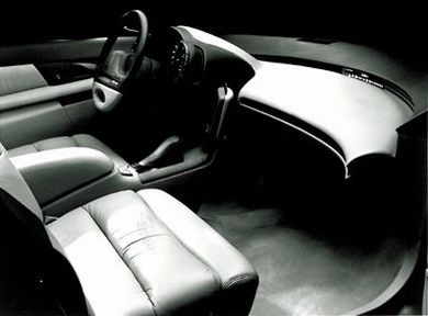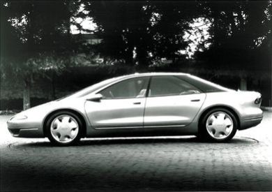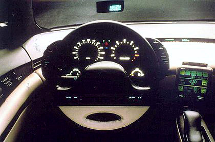 The Oldsmobile Anthem four-door concept features a long, sloped front end with a steeply raked windshield, sweeping instrument panel, all-glass roof, and airbags on both sides of the front seats. A pivoting, reconfigurable screen, mounted between the front buckets, displayed a full navigation and visual information system.