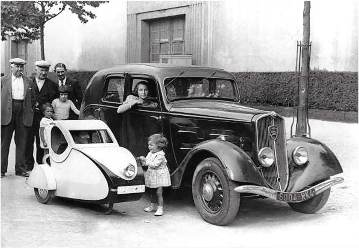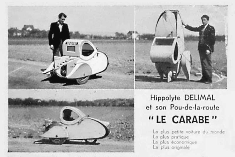 Le Carabe was a microcar designed by the French inventor Hippolyte Delimar, notable for being one of the world's smallest cars. Constructed primarily from standard bicycle parts, the car featured a wooden, closed-body design. Measuring just 75 cm in height and 73 cm in width, Le Carabe was extremely lightweight at only 45 kg. Powered by a bicycle engine, it could reach speeds of 30 to 40 km/h, making it surprisingly efficient for its size. Its fuel consumption was minimal, capable of traveling 100 kilometers on just 2 liters of gasoline, highlighting its innovation in fuel efficiency.